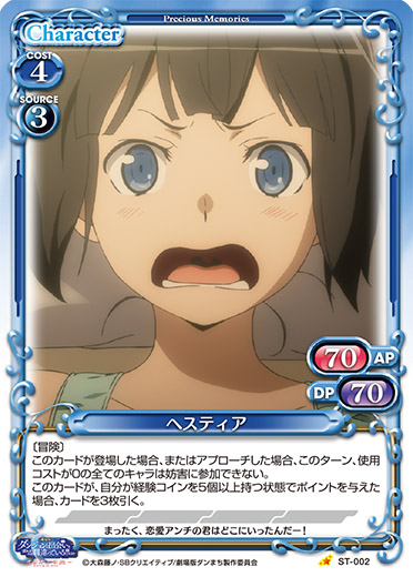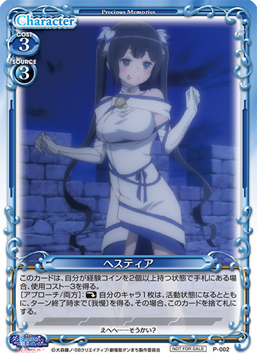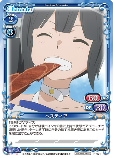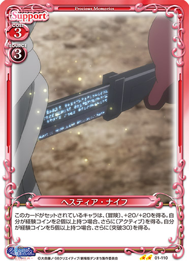 | このカードがセットされているキャラは、〔冒険〕、+20/+20を得る。自分が経験コインを2個以上持つ場合、さらに〔アクティブ〕を得る。自分が経験コインを5個以上持つ場合、さらに〔突破30〕を得る。 | ||
