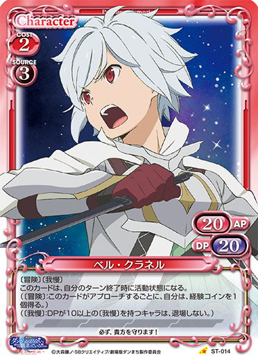 | 〔冒険〕このカードは、自分のメインエリアに使用コストが4以上のキャラがいる場合、+20/+20を得る。(〔冒険〕:このカードがアプローチするごとに、自分は、経験コインを1個得る。) | ||