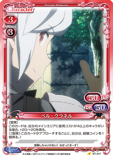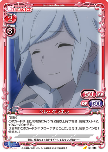 | 〔冒険〕このカードのアプローチで相手のキャラが退場した場合、カードを1枚引く。(〔冒険〕:このカードがアプローチするごとに、自分は、経験コインを1個得る。) | ||