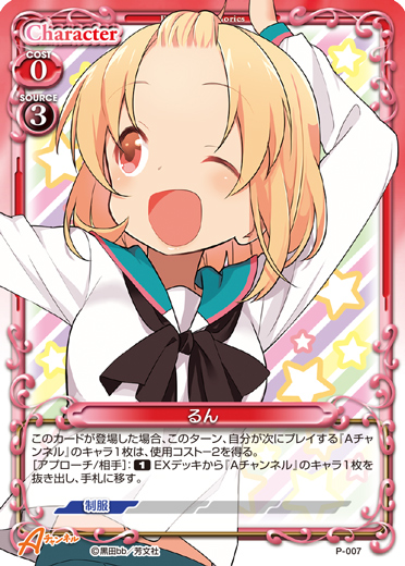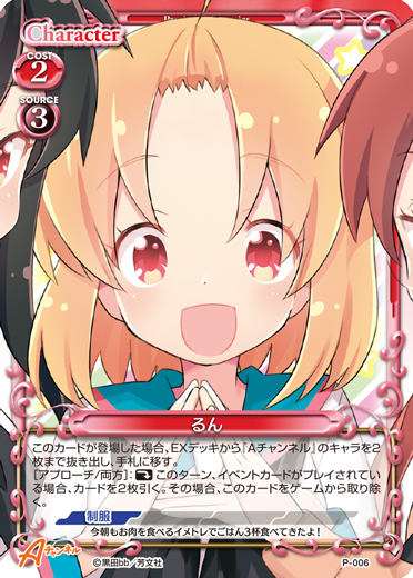 | このカードが登場した場合、このターン、自分が次にプレイする『Aチャンネル』のキャラ1枚は、使用コスト-2を得る。[アプローチ/相手]:《1》EXデッキから『Aチャンネル』のキャラ1枚を抜き出し、手札に移す。 | ||
