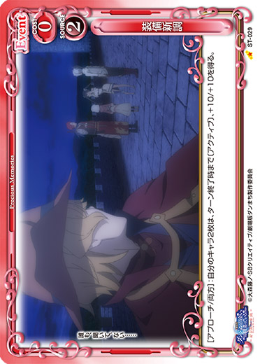 | [メイン/自分]:自分のキャラ1枚を休息状態にする。その場合、相手のキャラ1枚を休息状態にする。自分が経験コインを5個以上持つ場合、その後、相手のキャラ1枚を休息状態にする。 | ||