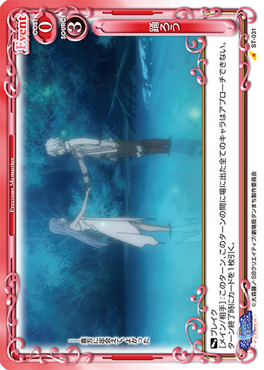 | 〔ブレイク〕[メイン/相手]:このターン、このターンの間に場に出た全てのキャラはアプローチできない。ターン終了時にカードを1枚引く。 | ||