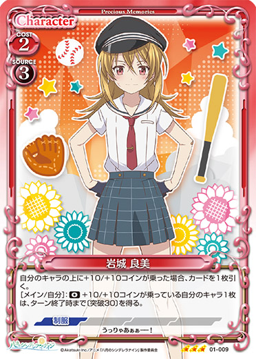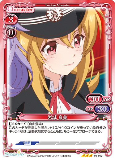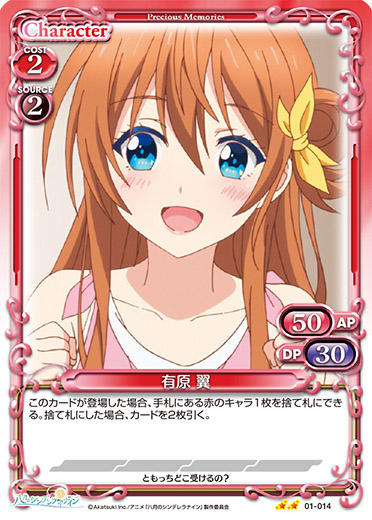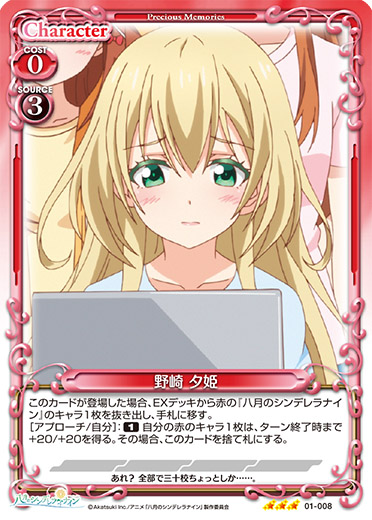 | このカードが登場した場合、EXデッキから赤の『八月のシンデレラナイン』のキャラ1枚を抜き出し、手札に移す。[アプローチ/自分]:《1》自分の赤のキャラ1枚は、ターン終了時まで+20/+20を得る。その場合、このカードを捨て札にする。 | ||
