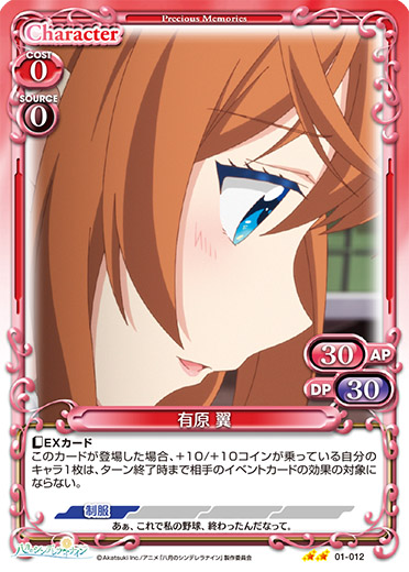 | このカードが自分の「有原 翼」がいる状態で登場した場合、このカードの上に+10/+10コインを1個乗せる。このカードの上に+10/+10コインが乗っている場合、このカードは、自分のターン終了時に活動状態になる。 | ||
