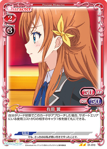 | 自分がリード状態でこのカードがアプローチした場合、サポートエリアにいる使用コストが0の相手のキャラ1枚を捨て札にできる。 | ||