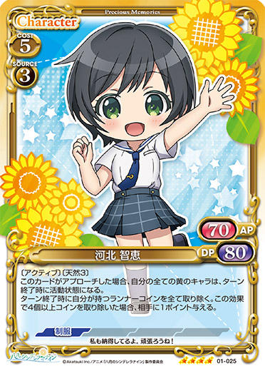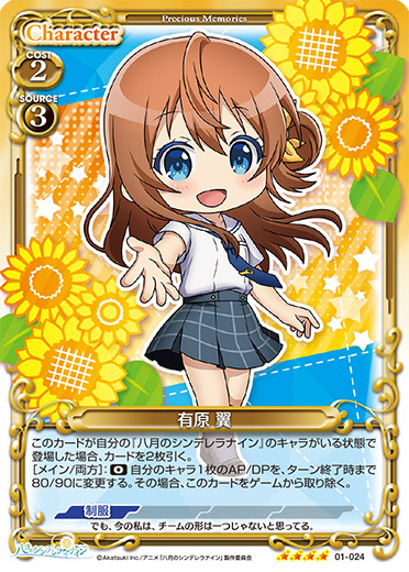 | 〔アクティブ〕自分がリード状態の場合、このカードは、自分のアプローチフェイズでも登場できる。このカードのアプローチで相手のキャラが退場した場合、手札にある黄の『八月のシンデレラナイン』のキャラ1枚を場に出すことができる。 | ||