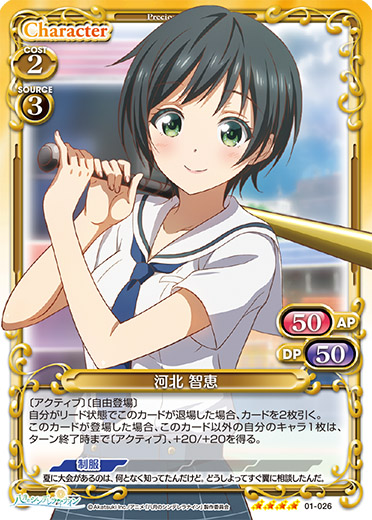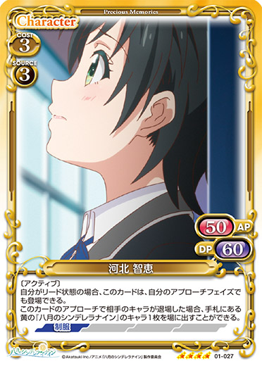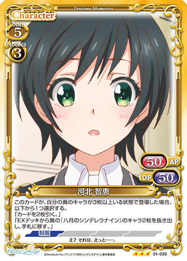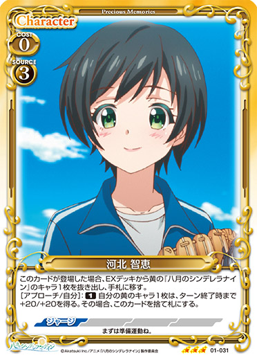 | このカードが自分の『八月のシンデレラナイン』のキャラがいる状態で登場した場合、カードを2枚引く。[メイン/両方]:《0》自分のキャラ1枚のAP/DPを、ターン終了時まで80/90に変更する。その場合、このカードをゲームから取り除く。 | ||