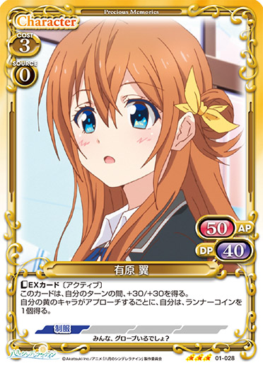 | 〔EXカード〕〔アクティブ〕このカードは、自分のターンの間、+30/+30を得る。自分の黄のキャラがアプローチするごとに、自分は、ランナーコインを1個得る。 | ||