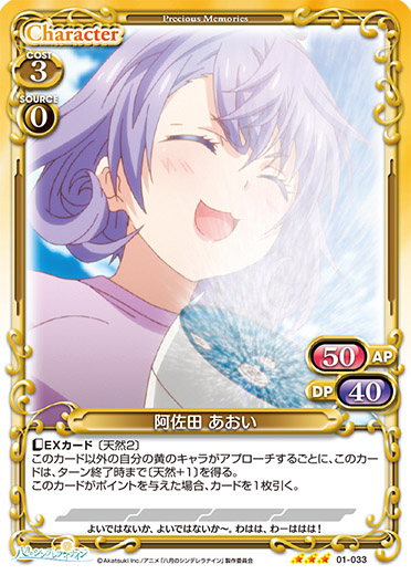 | 〔EXカード〕〔天然2〕このカード以外の自分の黄のキャラがアプローチするごとに、このカードは、ターン終了時まで〔天然+1〕を得る。このカードがポイントを与えた場合、カードを1枚引く。 | ||