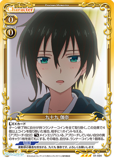 | 〔EXカード〕ターン終了時に自分が持つランナーコインを全て取り除く。この効果で4個以上コインを取り除いた場合、相手に1ポイント与える。[アプローチ/自分]:《休》メインエリアにいる、アプローチしていない自分の黄のキャラ1枚を捨て札にする。その場合、自分は、ランナーコインを1個得る。 | ||