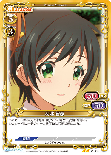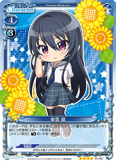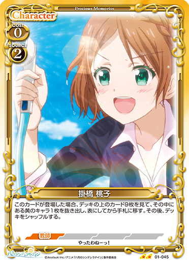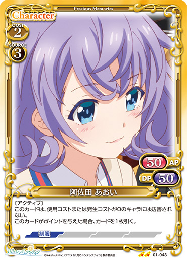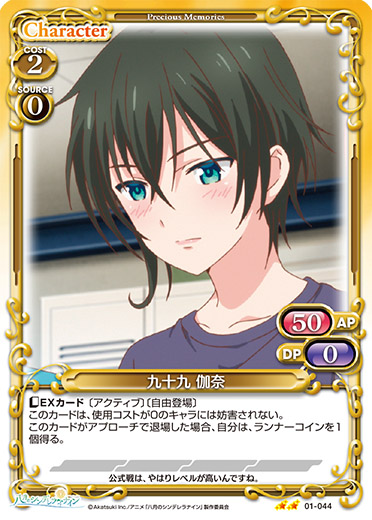 | このカードが登場した場合、EXデッキから『八月のシンデレラナイン』のカード1枚を抜き出し、手札に移す。このカードが退場した場合、自分のキャラ1枚を活動状態にする。 | ||