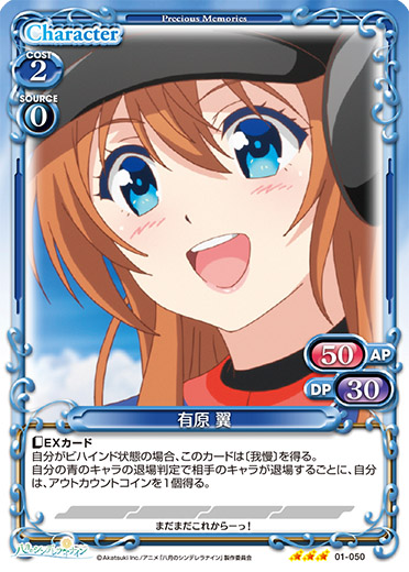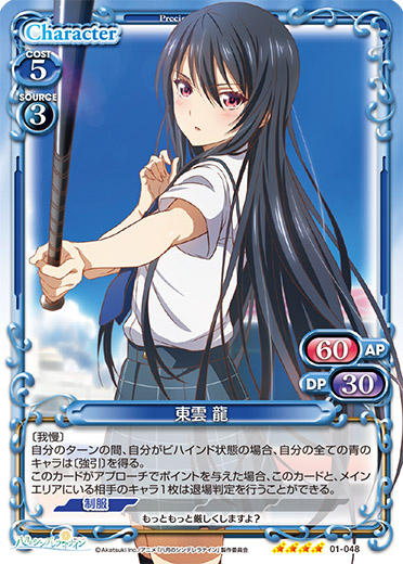 | 〔我慢〕自分のターンの間、自分がビハインド状態の場合、自分の全ての青のキャラは〔強引〕を得る。このカードがアプローチでポイントを与えた場合、このカードと、メインエリアにいる相手のキャラ1枚は退場判定を行うことができる。 | ||