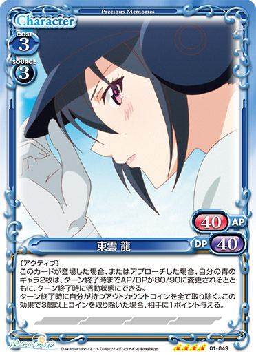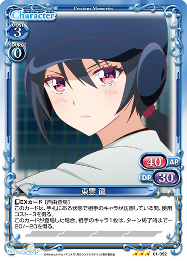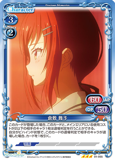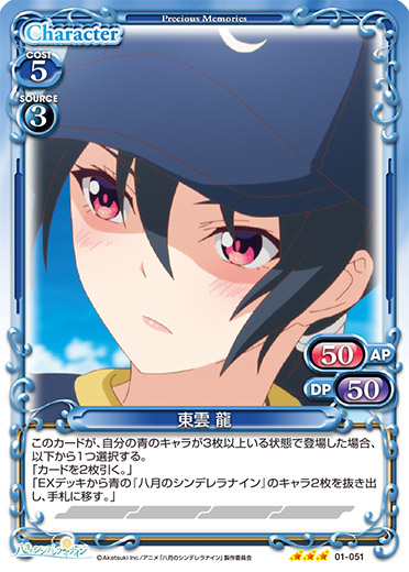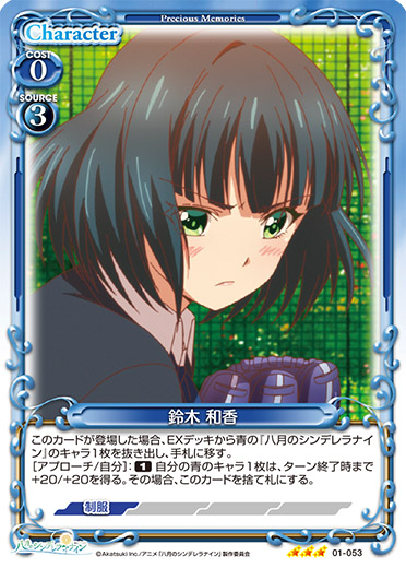 | このカードが登場した場合、EXデッキから青の『八月のシンデレラナイン』のキャラ1枚を抜き出し、手札に移す。[アプローチ/自分]:《1》自分の青のキャラ1枚は、ターン終了時まで+20/+20を得る。その場合、このカードを捨て札にする。 | ||