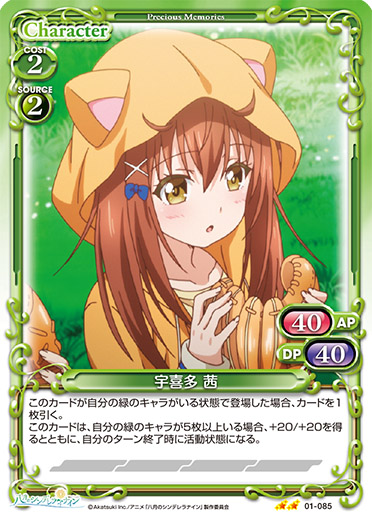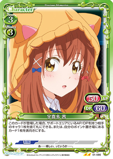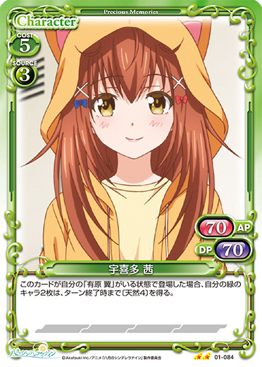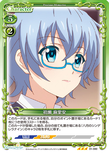 | このカードは、手札にある場合、自分のポイント置き場にあるカード1枚につき使用コスト-1を得る。このカードが登場した場合、自分の捨て札置き場にある『八月のシンデレラナイン』のキャラ2枚を手札に移す。 | ||