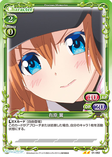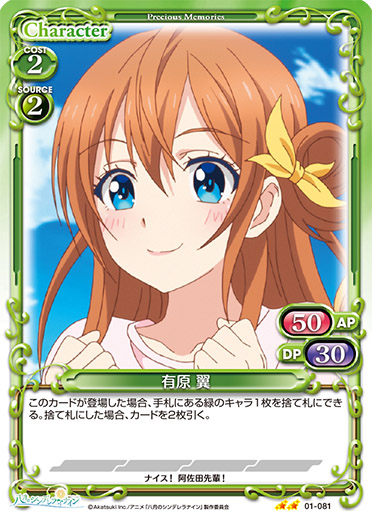 | このカードが自分の「有原 翼」がいる状態で登場した場合、自分の緑のキャラ2枚は、ターン終了時まで〔天然4〕を得る。 | ||