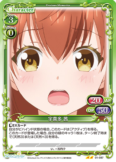 | 〔EXカード〕自分がビハインド状態の場合、このカードは〔アクティブ〕を得る。このカードが登場した場合、自分の緑のキャラ1枚は、ターン終了時まで〔天然3〕または〔天然+3〕を得る。 | ||