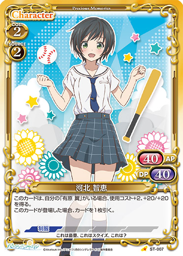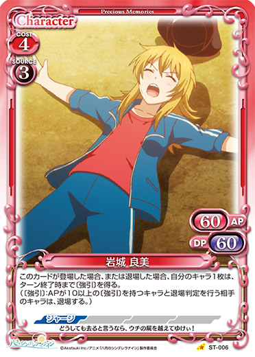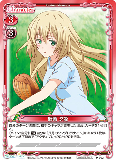 | このカードが登場した場合、自分の捨て札置き場にある『八月のシンデレラナイン』のキャラ1枚を手札に移す。 | ||