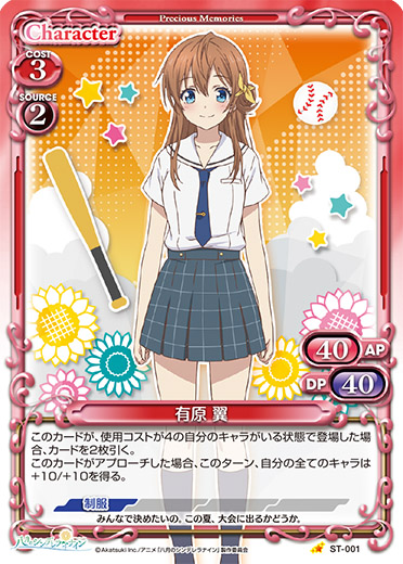 | このカードは、自分の「有原 翼」がいる場合、使用コスト+2、+20/+20を得る。このカードが登場した場合、カードを1枚引く。 | ||