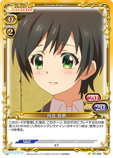 | このカードが登場した場合、このターン、自分が次にプレイする元の使用コストが4の『八月のシンデレラナイン』のキャラ1枚は、使用コスト-4を得る。 | ||