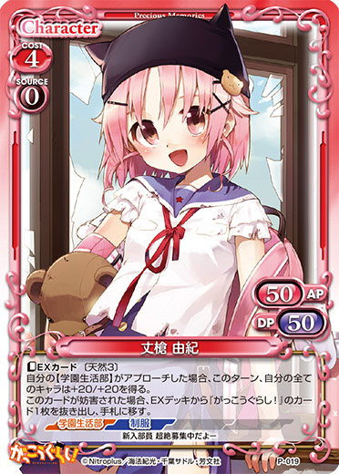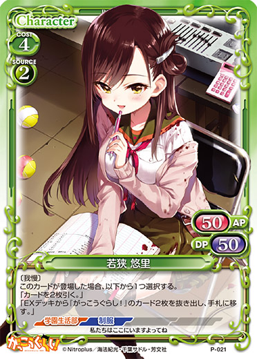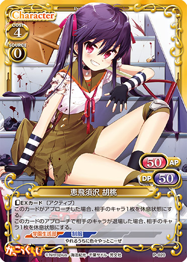 | 〔EXカード〕〔天然3〕自分の【学園生活部】がアプローチした場合、このターン、自分の全てのキャラは+20/+20を得る。このカードが妨害された場合、EXデッキから『がっこうぐらし!』のカード1枚を抜き出し、手札に移す。 | ||