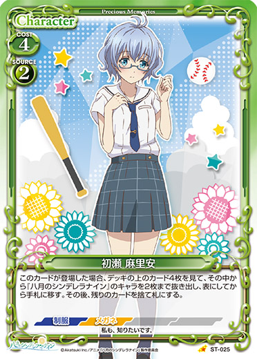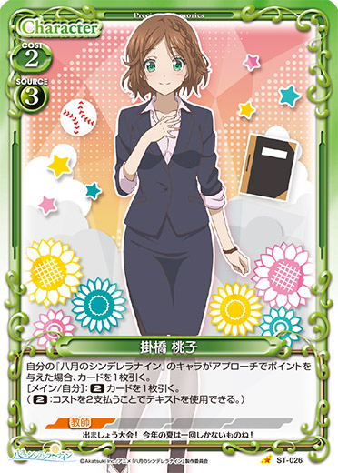 | このカードが登場した場合、デッキの上のカード4枚を見て、その中から『八月のシンデレラナイン』のキャラを2枚まで抜き出し、表にしてから手札に移す。その後、残りのカードを捨て札にする。 | ||