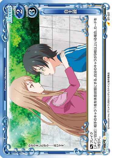 | 〔ブレイク〕[メイン/自分]:相手のキャラ1枚を休息状態にする。自分のキャラが9枚以上いる場合、カードを1枚引く。 | ||