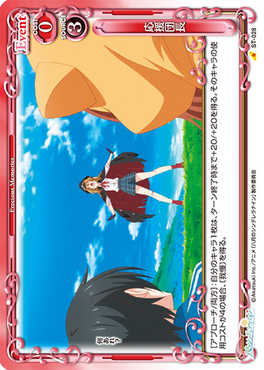 | [アプローチ/両方]:自分のキャラ1枚は、ターン終了時まで+20/+20を得る。そのキャラの使用コストが4の場合、〔我慢〕を得る。 | ||