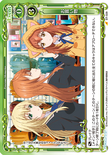 | 〔ブレイク〕[メイン/相手]:このターン、このターンの間に場に出た全てのキャラはアプローチできない。ターン終了時にカードを1枚引く。 | ||
