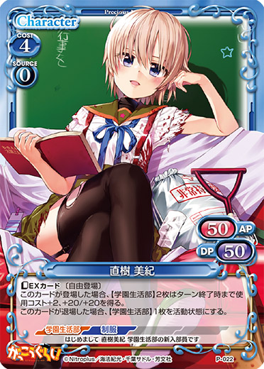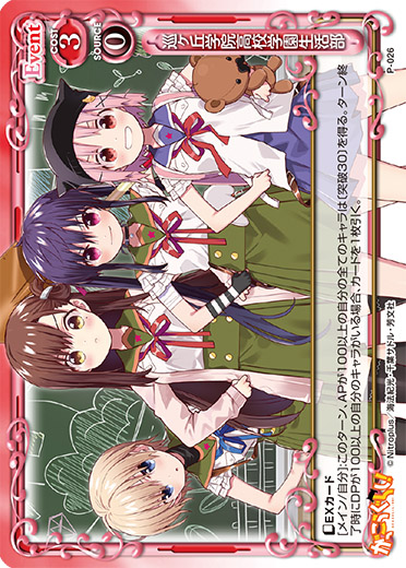 | 〔EXカード〕〔自由登場〕このカードが登場した場合、【学園生活部】2枚はターン終了時まで使用コスト+2、+20/+20を得る。このカードが退場した場合、【学園生活部】1枚を活動状態にする。 | ||