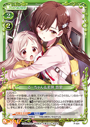 | 〔コンビ〕APまたはDPが100以上の【学園生活部】がアプローチしている間、相手は、使用コストが0のカードをプレイできない。[アプローチ/自分]:《休》自分のキャラ1枚のAP/DPをターン終了時まで自分の【学園生活部】1枚のAP/DPと同じ値に変更する。 | ||