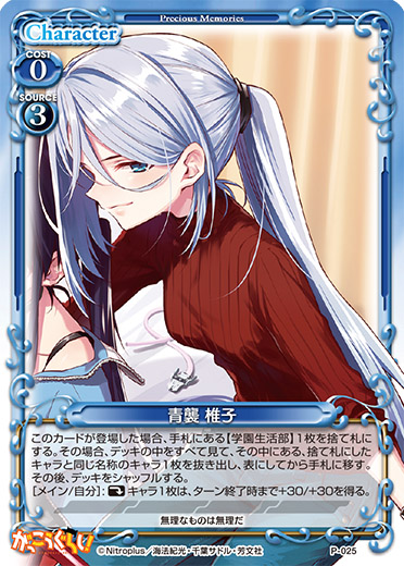 | このカードが登場した場合、手札にある【学園生活部】1枚を捨て札にする。その場合、デッキの中をすべて見て、その中にある、捨て札にしたキャラと同じ名称のキャラ1枚を抜き出し、表にしてから手札に移す。その後、デッキをシャッフルする。[メイン/自分]:《休》キャラ1枚は、ターン終了時まで+30/+30を得る。 | ||