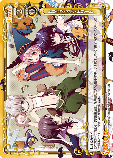 | 〔EXカード〕 [アプローチ/自分]:【学園生活部】を妨害している相手のキャラ1枚は、ターン終了時まで-50/-50を得るとともに、テキストが無効になる。 | ||