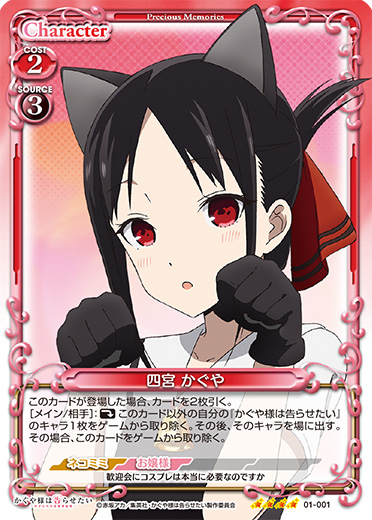 | このカードが登場した場合、カードを2枚引く。[メイン/相手]:《休》このカード以外の自分の『かぐや様は告らせたい』のキャラ1枚をゲームから取り除く。その後、そのキャラを場に出す。その場合、このカードをゲームから取り除く。 | ||