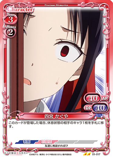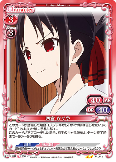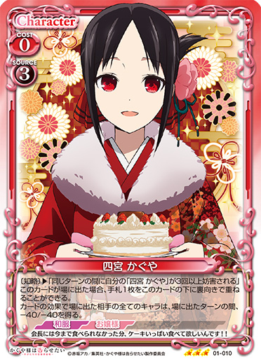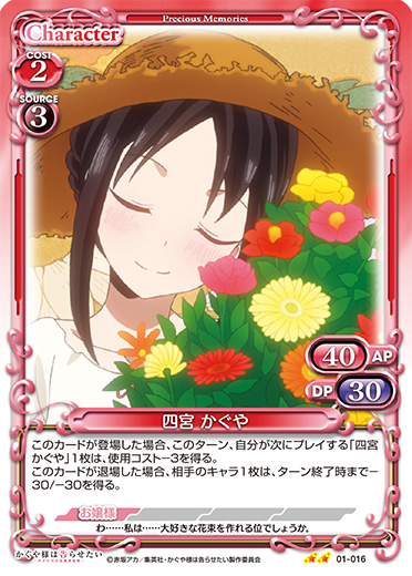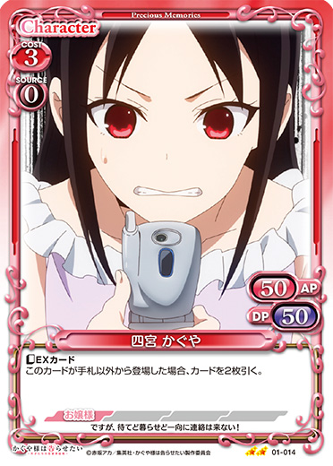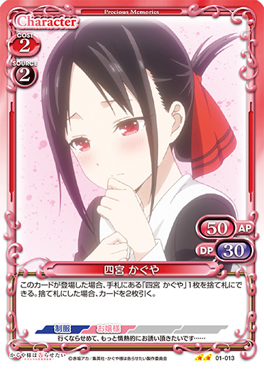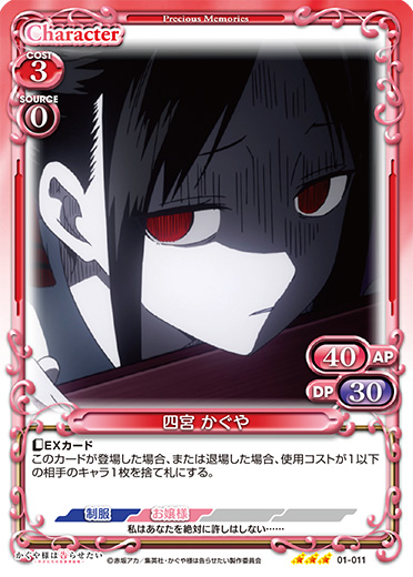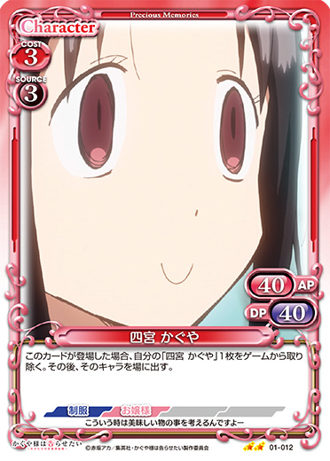 | このカードが登場した場合、このターン、自分が次にプレイする「四宮 かぐや」1枚は、使用コスト-3を得る。このカードが退場した場合、相手のキャラ1枚は、ターン終了時まで-30/-30を得る。 | ||