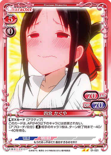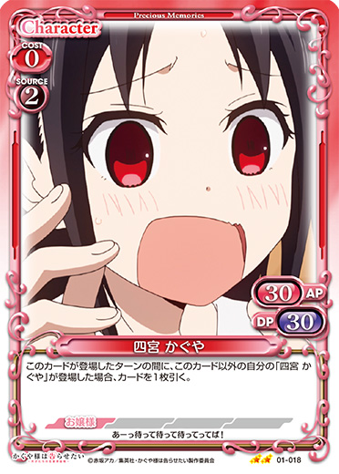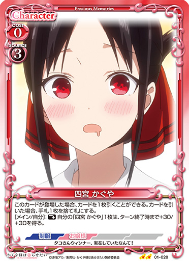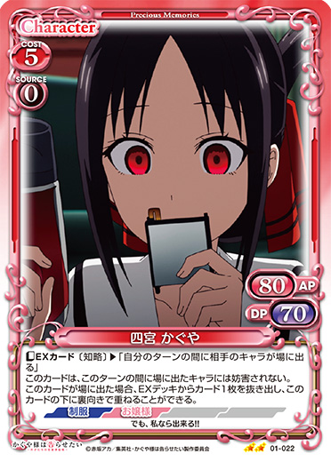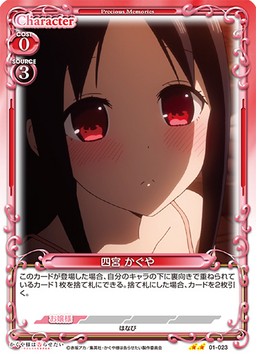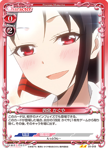 | このカードは、相手のメインフェイズでも登場できる。このカードが登場した場合、自分の「四宮 かぐや」1枚をゲームから取り除く。その後、そのキャラを場に出す。 | ||
