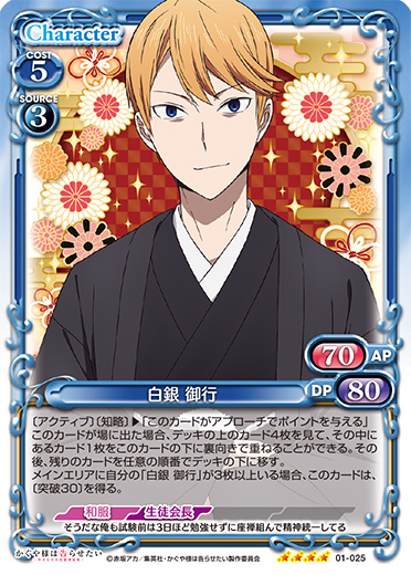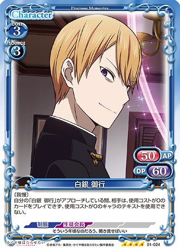 | 〔我慢〕自分の「白銀 御行」がアプローチしている間、相手は、使用コストが0のカードをプレイできず、使用コストが0のキャラのテキストを使用できない。 | ||