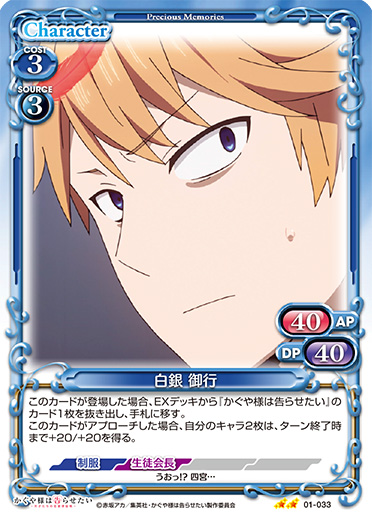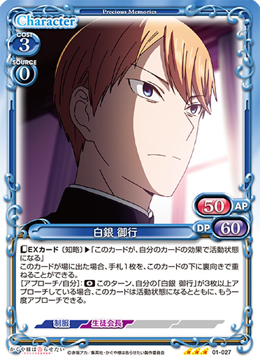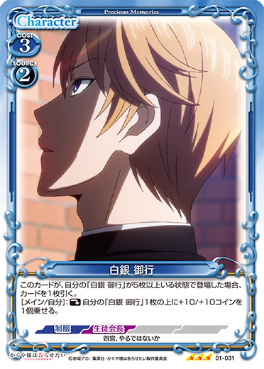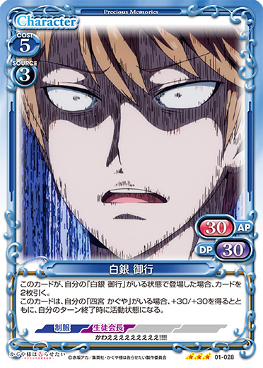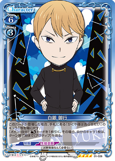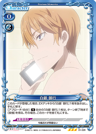 | このカードが、自分の「白銀 御行」がいる状態で登場した場合、カードを2枚引く。このカードは、自分の「四宮 かぐや」がいる場合、+30/+30を得るとともに、自分のターン終了時に活動状態になる。 | ||