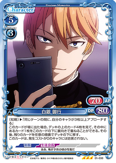 | 〔突破30〕このカードは、自分のターンの間、自分の「白銀 御行」1枚につき+10/+10を得る。このカードがアプローチしている間、相手がカードをプレイした場合、EXデッキから「白銀 御行」1枚を抜き出し、手札に移す。 | ||