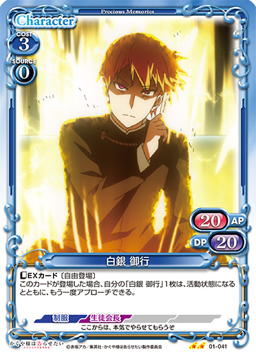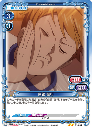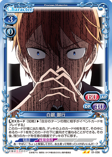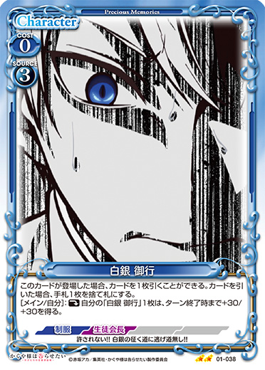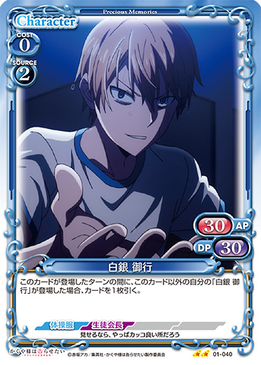 | このカードは、相手のメインフェイズでも登場できる。このカードが登場した場合、自分の「白銀 御行」1枚をゲームから取り除く。その後、そのキャラを場に出す。 | ||