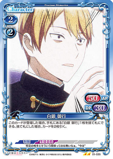 | このカードが登場した場合、手札にある「白銀 御行」1枚を捨て札にできる。捨て札にした場合、カードを2枚引く。 | ||