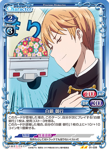 | このカードが登場した場合、このターン、自分が次にプレイする「白銀 御行」1枚は、使用コスト-3を得る。このカードが退場した場合、自分の「白銀 御行」1枚の上に+10/+10コインを1個乗せる。 | ||