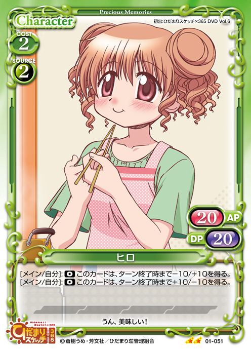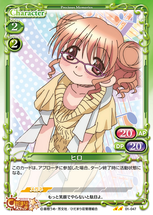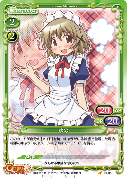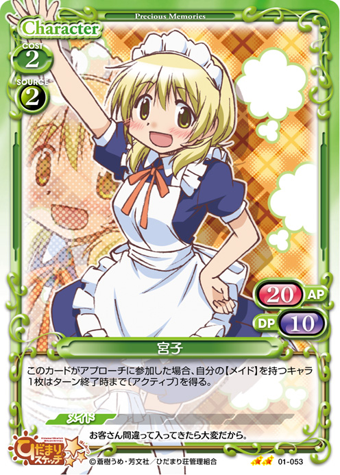 | このカードが自分の【メイド】を持つキャラがいる状態で登場した場合、相手のキャラ1枚はターン終了時まで±0/-20を得る。 | ||