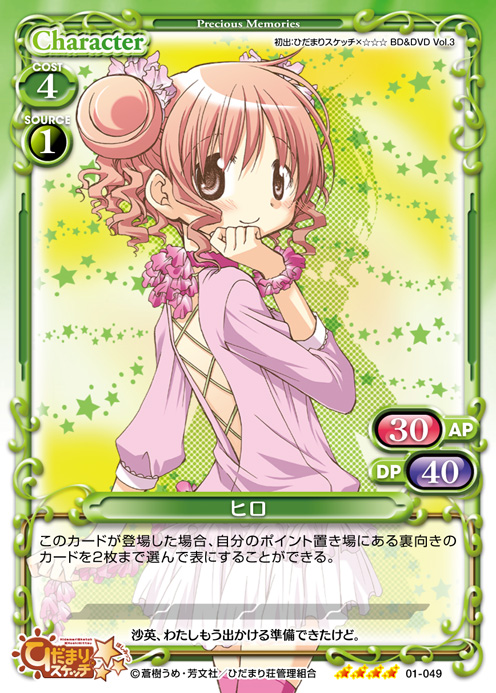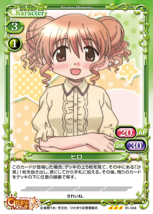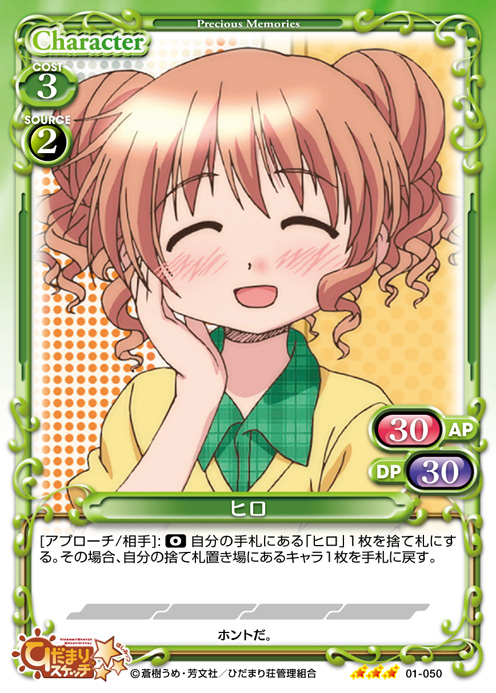 | [アプローチ/相手]:《0》自分の手札にある「ヒロ」1枚を捨て札にする。その場合、自分の捨て札置き場にあるキャラ1枚を手札に戻す。 | ||