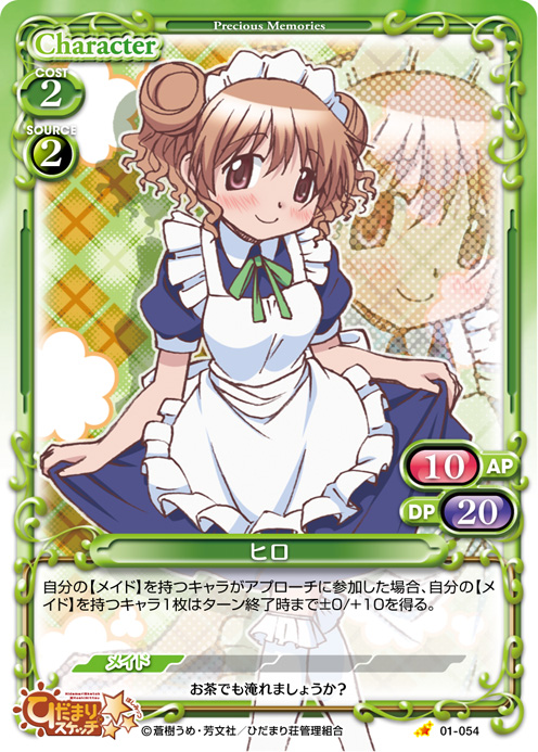 | 自分の【メイド】を持つキャラがアプローチに参加した場合、自分の【メイド】を持つキャラ1枚はターン終了時まで±0/+10を得る。 | ||