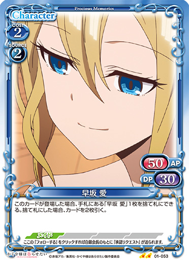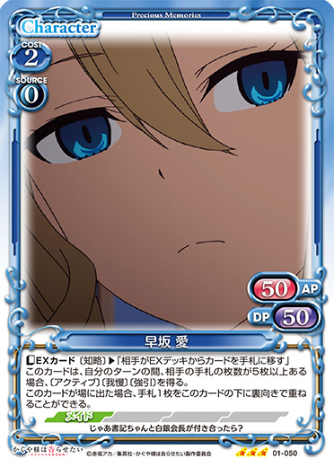 | このカードが登場した場合、手札にある「早坂 愛」1枚を捨て札にできる。捨て札にした場合、カードを2枚引く。 | ||