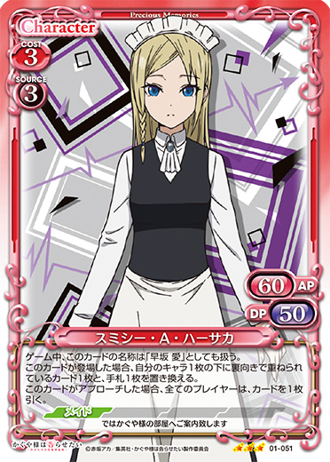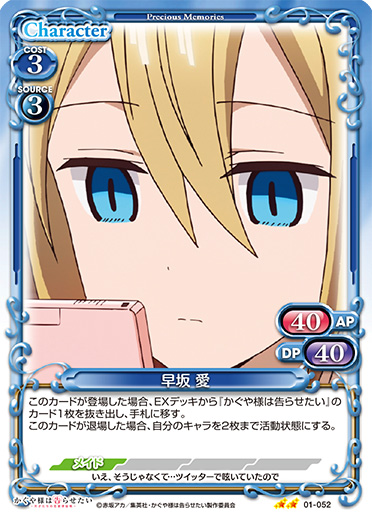 | このカードが登場した場合、EXデッキから『かぐや様は告らせたい』のカード1枚を抜き出し、手札に移す。このカードが退場した場合、自分のキャラを2枚まで活動状態にする。 | ||
