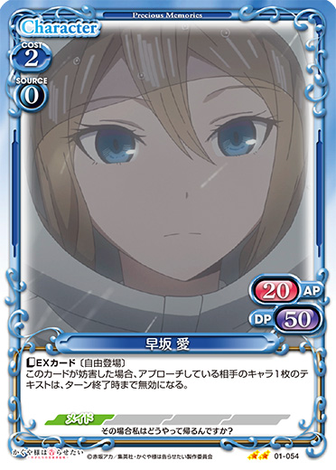 | ゲーム中、このカードの名称は「早坂 愛」としても扱う。このカードが登場した場合、自分のキャラ1枚の下に裏向きで重ねられているカード1枚と、手札1枚を置き換える。このカードがアプローチした場合、全てのプレイヤーは、カードを1枚引く。 | ||