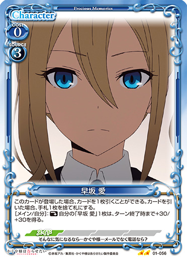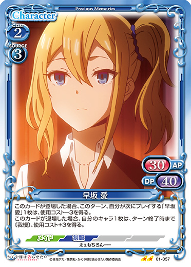 | このカードが登場した場合、このターン、自分が次にプレイする「早坂 愛」1枚は、使用コスト-3を得る。このカードが退場した場合、自分のキャラ1枚は、ターン終了時まで〔我慢〕、使用コスト+3を得る。 | ||