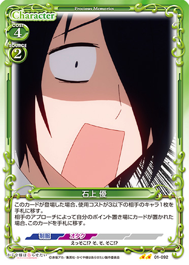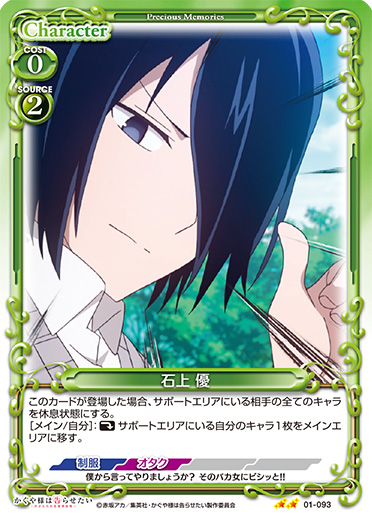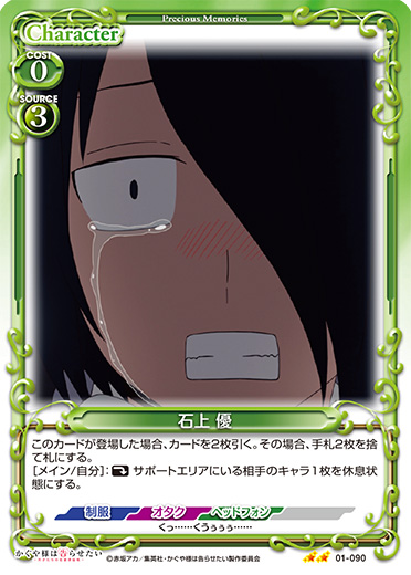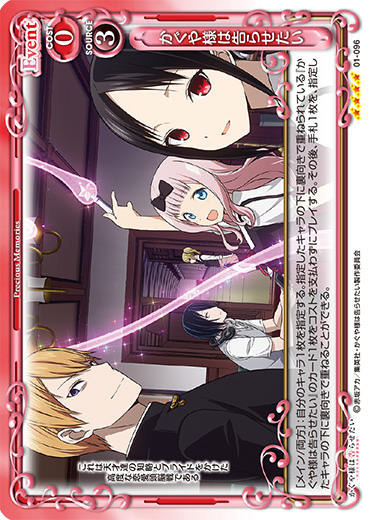 | [メイン/両方]:自分のキャラ1枚を指定する。指定したキャラの下に裏向きで重ねられている『かぐや様は告らせたい』のカード1枚をコストを支払わずにプレイする。その後、手札1枚を、指定したキャラの下に裏向きで重ねることができる。 | ||