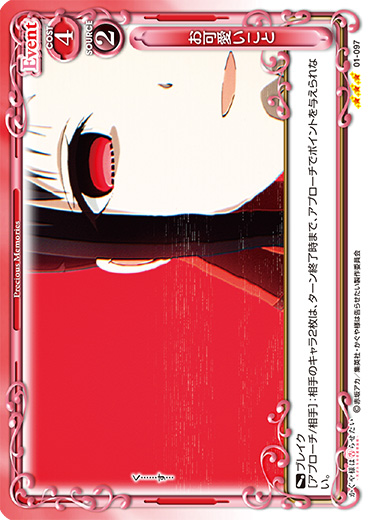| 〔ブレイク〕[アプローチ/相手]:相手のキャラ2枚は、ターン終了時まで、アプローチでポイントを与えられない。 | ||